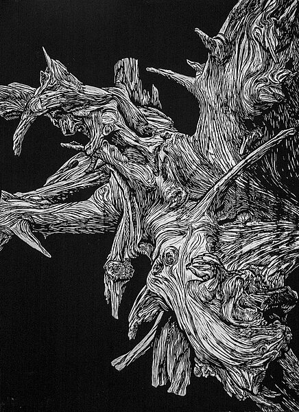Privilégiant la gravure et le noir et blanc, particulièrement les techniques directes (burin, bois, lino), elle puise ses sujets d’inspiration dans l’architecture de la nature, osseuse, végétale, minérale.