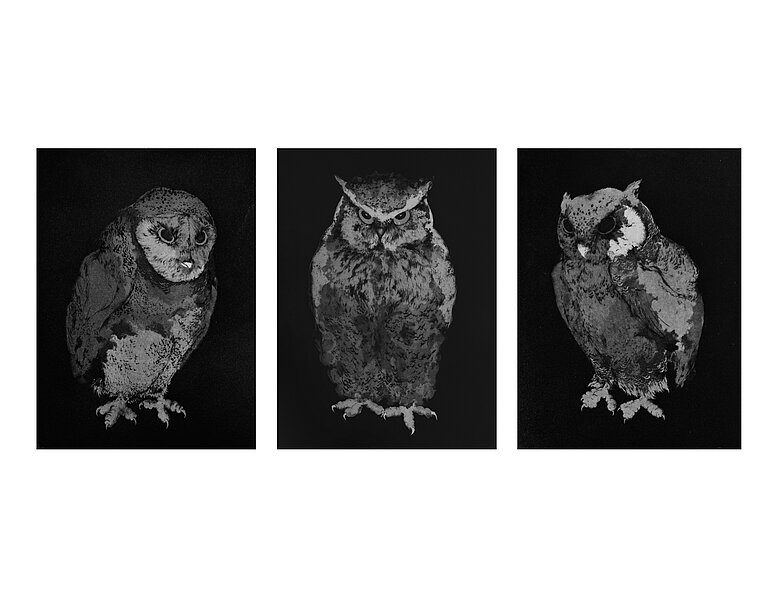 La représentation de l’animal a toujours guidé mon inspiration, à la façon d’une allégorie qui me permettait de parler de la nature humaine. Parallèlement à cette approche et après m’être plongée dans l’étude de travaux d’artistes utilisant l’animal, notamment Goya avec ses planches gravées et ses peintures noires, je cherche à approfondir ma démarche en m’intéressant à la question de l’altérité posée à travers l’animal.
