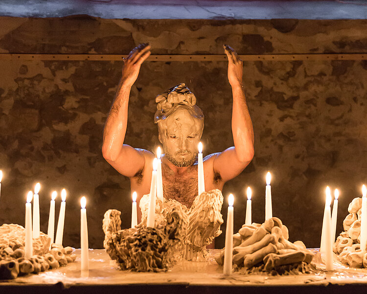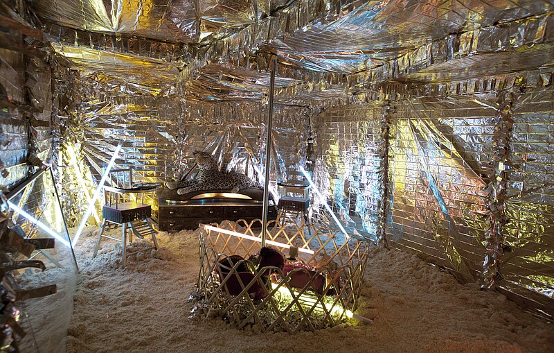 Le travail de Romuald Dumas Jandolo nous plonge dans une vision lyrique et magique d'un espace aux frontières de la rêverie. Ses installations s'apparentent à l'idée d'oeuvre d'art total. Dans une profusion de signes, l'artiste embrasse l'espace d'exposition d'un geste théâtralisé.