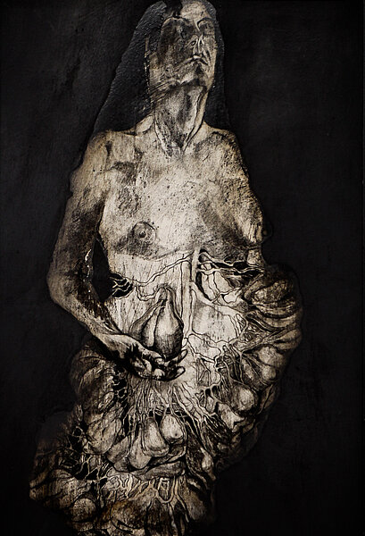 Au début de sa pratique, Nathalie Bourdreux recouvrait ses tableaux de résine et constituait des reliquaires où la toile peinte, principalement des corps humains, était l’image relique. Puis elle a choisi de travailler sur papier élaborant une nouvelle peinture délestée d’un trop plein de matière, pour aborder le dessin. Elle s'est ainsi ouverte à de nouveaux sujets : vaches, corridas, cathédrales... Pendant plusieurs années elle a réalisé un travail sur les Ménines, à travers, notamment, des portraits de l’Infante Marguerite.