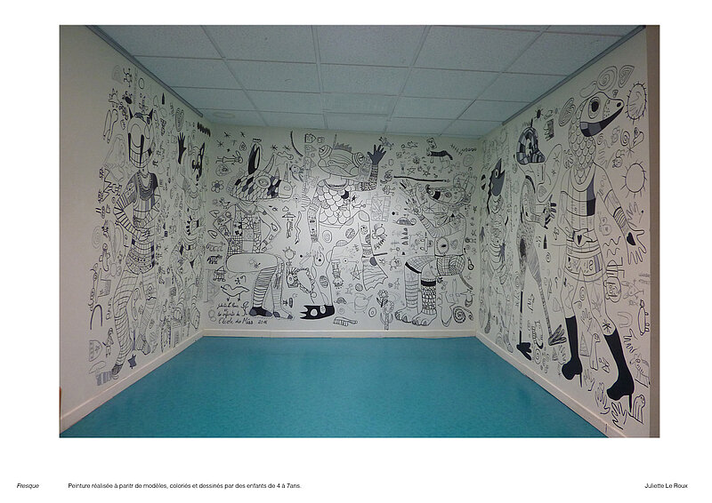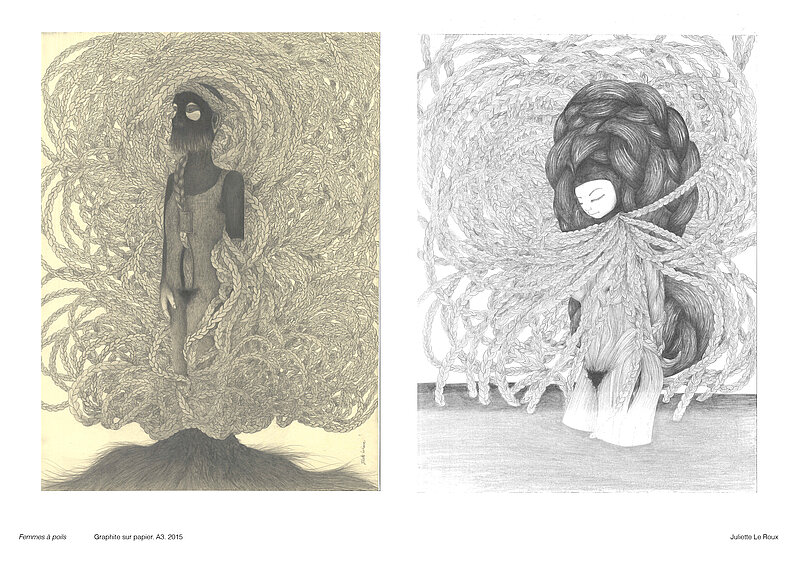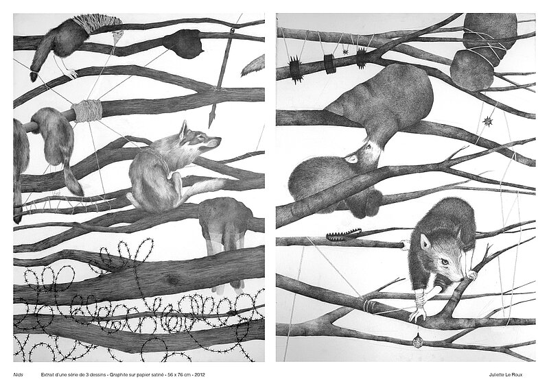 Juliette Le Roux est diplômée de L’École Supérieure des Arts Décoratifs de Strasbourg. A partir du dessin d'observation de la nature, du monde animal et végétal elle crée et compose des scènes figuratives et narratives qui ne racontent pas d'histoires prédéfinies. Son processus créatif se centre particulièrement autour du travail au crayon, sur des supports allant du papier, au bois encollé ou encore au mur.