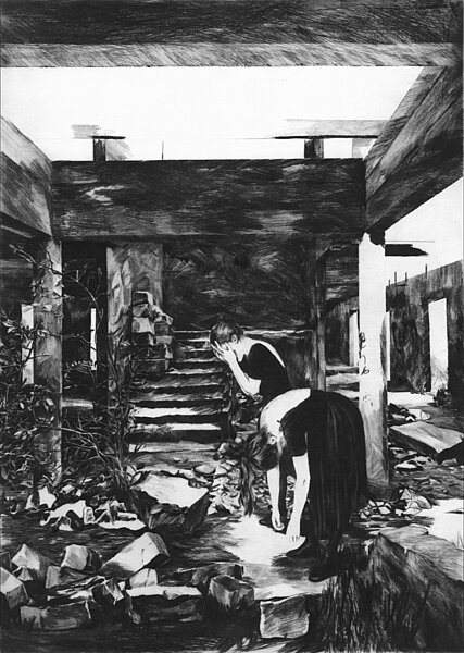 Influencée par l’histoire de l’Espagne, son mélange de cultures et les influences qui s’y sont succédé (mudéjar, mozarabe…) elle explore les traces qui en restent aujourd’hui dans le paysage contemporain. Son travail cherche alors à traduire ces époques successives en exploitant la particularité de la pointe sèche, dont les tailles s’écrasent doucement au fur et à mesure des passages sous presse.