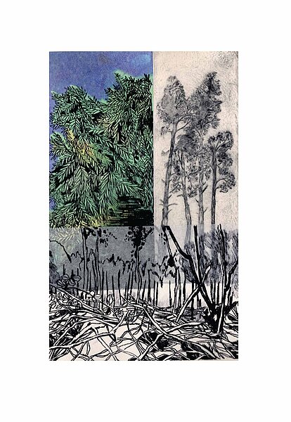 Sa pratique artistique se concentre sur la contemplation des paysages, avec pour point de départ le souvenir des lieux parcourus ou familiers comme terrain idéal pour fabriquer une image. Elle y observe le temps à l’œuvre et développe sa réflexion autour des “paysages palimpsestes”, qui révèlent leur profondeur en laissant apparaître l’empreinte du temps sous les strates de leurs multiples variations. La gravure lui permet de ainsi donner une véritable matière à tout cela.