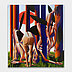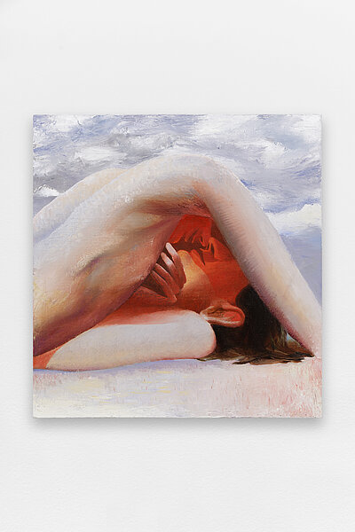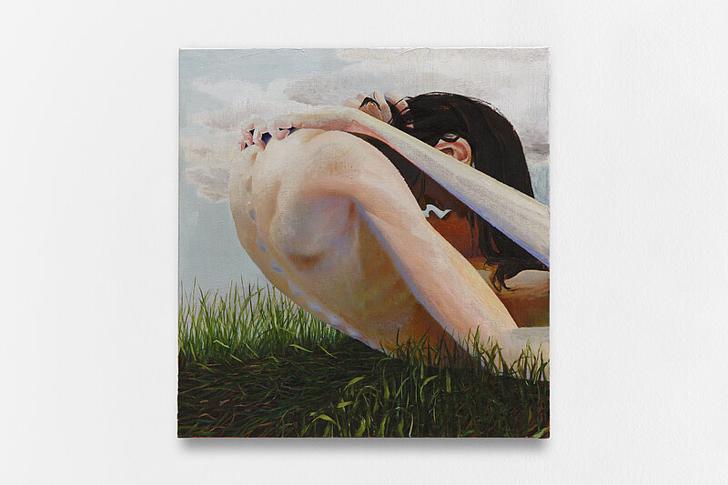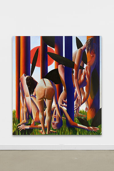 Dans l’atelier, avec l’entêtement d’un maniériste traquant l’anarchie des corps, il agence les figures, exagère les proportions et ajuste les perspectives. Si le travail de Laurent Proux se matérialise en peinture, son processus d’expérimentation passe autant par le collage que par les maquettes ainsi que par le travail de pose avec des modèles non professionnels. Une logique de production en plusieurs temps et à travers de multiples mediums qui emprunte autant à la peinture classique de Poussin qu’aux grandes mises en scène photographiques de Jeff Wall.