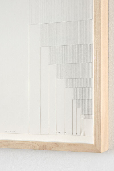 Ainsi, le projet est conçu comme un acte d'amour et de gratitude pour ces deux auteurs, mais aussi à d'autres artistes, enseignants ou mentors liés à ces deux figures par l'expérience de vie de l'artiste. Dans cette deuxième étape, cette recherche en forme d'hommage se matérialise en une série de dessins liés au texte de Nemours, ainsi qu'un ensemble de gravures résumant les deux aspects du projet. Une analyse qui se caractérise, comme dans la peinture de Nemours, par une recherche continue de l'essentiel où le dénominateur commun reste le dépouillement de tout ce qui est superflu, personnel et anecdotique, mais qui offrira aussi un espace pour des échappées et des moments insoupçonnés proches de sa poésie, aussi surréaliste que mathématique.