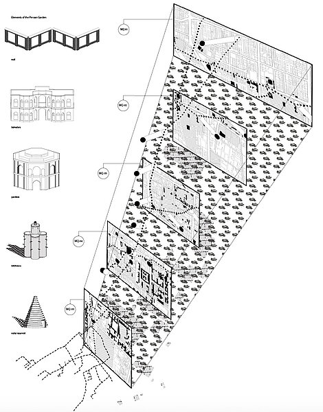 Esta antigua infraestructura, el qanat o viaje de agua en español, inventada en Irán, tiene más de tres mil años y se recoge en el tratado De arquitectura de Vitruvio, escrito en el año 18 a. C. Vuelve a aparecer en la Edad Media entre Oriente y Occidente, sobre una franja árida entre Sevilla, Marrakech y China, que pasa por la vía marítima entre Palermo y Chipre y une una serie de ciudades jardín medievales que conforman la ruta de la seda.