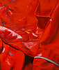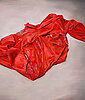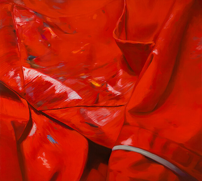 En este despliegue de cuadros cuyo denominador común es el color rojo, la artista continúa explorando algunos de los aspectos formales y conceptuales que la han ido acompañando en sus trabajos anteriores. Entre ellos, el cambio de escala, que opera sobredimensionando la trama de la tela roja –la de la ropa de trabajo, que se hace sujeto principal de estos cuadros– ampliando la visión del detalle y destacando con ello lo desapercibido. Aparecen así manchas y restos de pintura, a primera vista, carentes de interés, que terminan expresando y creando un microcosmos de relaciones cruzadas. Gracias a ellas las formas se manifiestan en el espacio y generan ritmos, asociaciones y distancias. Estas manchas físicas se convierten así en las huellas visibles del propio esfuerzo de la acción de obrar.