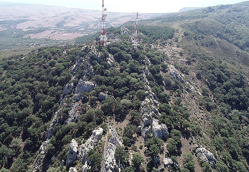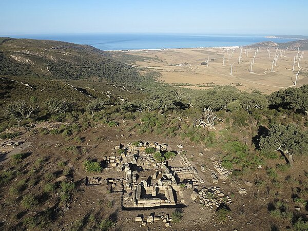 Le site archéologique de la Silla del Papa se trouve à 4 km de la côte, sur le point le plus élevé d’une petite chaîne côtière qui culmine à 457 m et constitue l’un des principaux points de contrôle du détroit à l’ouest de Tarifa (fig. 1 et 2). Le lieu présente trois importants atouts : de puissantes défenses naturelles, la proximité de plusieurs sources pérennes, et une position dominante offrant des vues lointaines dans toutes les directions. L’organisation spatiale de l’agglomération antique est conditionnée par l'existence de deux barres rocheuses parallèles orientées nord-sud qui délimitent un étroit couloir de 420 m de long (fig. 2). Des sondages ont montré que l’ensemble du site avait été occupé au Premier âge du Fer, du Xe au VIIe siècle a.C. Même en restituant un habitat à maillage espacé, tout porte à croire qu’il s’agissait, dès cette époque, d’une place centrale occupant plusieurs hectares.