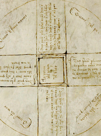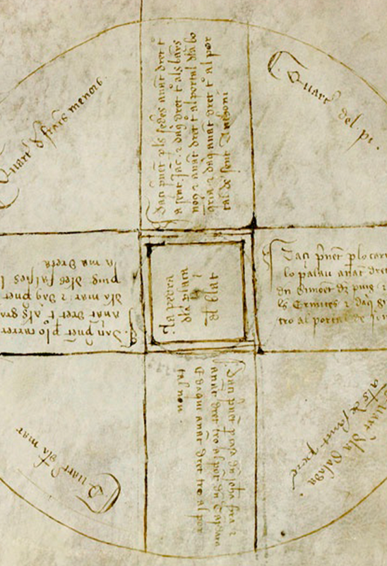 Visuel : Dibujo manuscrito de la piedra de la Plaça del Blat, grabado que representaba la ciudad y sus distritos administrativos. Llibre de cinquantenes de Barcelona. Fogatges. (1389). Consell de la Ciutat. Arxiu Històric de la Ciutat de Barcelona, Fons del Consell de la Ciutat i Ajuntament Modern CCAM 02.02/1B.XIX-05