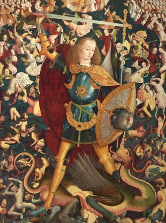 Imagen: Maestro de Zafra. San Miguel Arcángel. 1495 - 1500. Técnica mixta sobre tabla pasada a lienzo, 242 x 153 cm. Número de catálogo P001326. Madrid, Museo del Prado. Copyright de la imagen ©Museo Nacional del Prado