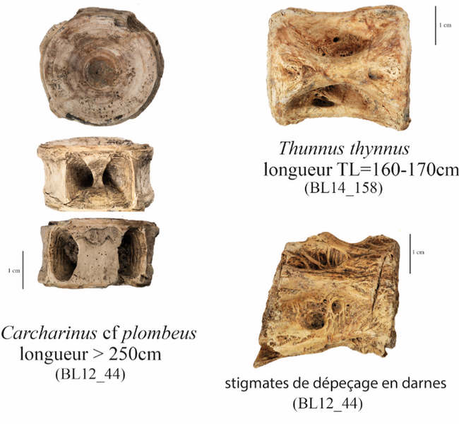 Le mobilier mis au jour dans ce secteur est d’une richesse considérable (monnaies, céramique, statutaire, restes organiques, …). Ce sont surtout les masses de tessons qui dominent notamment dans les stratigraphies des époques tardives. Non seulement ce matériel est d’un intérêt précieux pour fixer la chronologie des horizons stratigraphiques, mais il renseigne également sur la qualité de la ville et le mode de vie de ses habitants. La mise au jour et l’étude systématique par échantillonnage de toutes les catégories de céramiques (vaisselle de table, de service, de préparation, récipients à cuire, de stockage ou de transport) ont permis de montrer la permanence de l’insertion de Baelo dans des circuits commerciaux interprovinciaux (Bétique, Lusitanie, Afrique) à une époque où la ville est supposée avoir décliné. De nombreuses productions locales ou régionales longtemps négligées par les études céramologiques ont également été caractérisées. Par ailleurs, l’étude des restes organiques, en particulier ceux issus des rejets de consommation, a révélé l’existence d’une importante activité de débitage de bœuf et de thon dans l’Antiquité tardive (fig. 6). Cette activité témoigne à la fois du maintien d’une forte demande locale en viande et donc d’un peuplement relativement important de la ville, ainsi que de la survivance d’une activité de pêche et très probablement de fabriques de salaisons, une activité de tradition séculaire à Baelo.