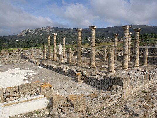 L’agglomération antique de Baelo se situe dans la baie de Bolonia, au cœur du détroit de Gibraltar, à la pointe méridionale de l’Espagne, sur le territoire de la commune actuelle de Tarifa (province de Cadix, Andalousie). Strabon signale qu’elle fut sous l’Empire le principal port d’embarquement pour Tanger, ainsi qu’un important centre de production de salaisons de poissons (Géographie, III, 1-8). Ses vestiges occupent une superficie d’une dizaine d’hectares intra-muros. Les premières occupations dans la baie remontent au IIe siècle av. J.-C., mais la première véritable agglomération date probablement de l’époque augustéenne (Sillières 1995, 53). Cette petite cité de Bétique obtint vraisemblablement sous le règne de Claude le statut privilégié de municipe romain. À partir de cette date, la ville fut dotée d’une nouvelle parure monumentale (fig. 1). Au IIIe siècle, des traces de ruines des édifices antérieurs, probablement liées à un séisme, ont été constatées. La ville se transforme alors mais ne disparaît pas et l’occupation se maintient longtemps après la fin de l’administration provinciale romaine en Hispanie, jusqu’à la fin du VIe siècle voire au début du VIIe siècle apr. J.-C, au cœur de la période wisigothique, quand elle est définitivement abandonnée. Son abandon au début du VIIe siècle a permis une bonne conservation de la ville antique, ce qui en fait un jalon essentiel dans notre connaissance de l’urbanisme des cités romaines de la péninsule Ibérique, et de l’Occident romain.