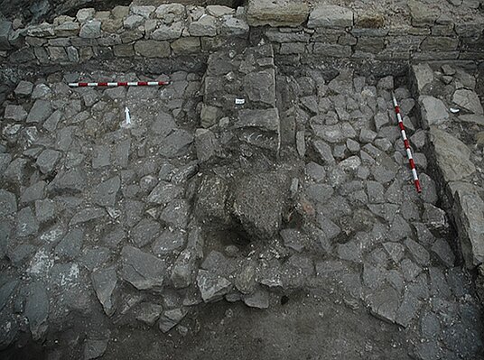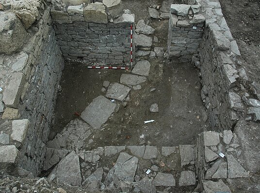 L’édifice monumental public et le portique ont également été réoccupés entre la fin du IVe et le VIe siècle apr. J.-C. par des structures de nature domestique et artisanale relevant de quatre époques d’occupations différentes. Ces constructions s’appuient sur des murs préexistants ou construits ex nihilo avec des matériaux de réemploi. Les sols en terre reposaient sur des préparations en pierres ou en galets (fig. 5). Les fouilles conduites sur ce secteur ont également permis de mettre au jour les fondations d’un très grand édifice tardif (18 m sur 13 m) installées sur les vestiges arasés de précédentes occupations tardives. En raison du fort arasement des vestiges, la datation de cet édifice, comprise entre le VIe et le XIXe siècle, est encore difficile à préciser.
