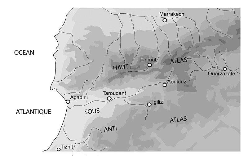 Le programme de recherche La montagne d’Îgîlîz et le pays des Arghen s’intéresse à un haut lieu de l’histoire marocaine et du Moyen Âge maghrébin, jusqu’alors resté totalement inédit sur le plan archéologique. La montagne d’Igîlîz est située dans l’Anti-Atlas, à une soixantaine de kilomètres à l’est sud-est de Taroudant, non loin de la plaine du Sous (fig. 1). Elle est connue par les textes médiévaux pour avoir abrité le lieu de naissance d’Ibn Tûmart, célèbre juriste et théologien berbère qui, au début des années 1120, va initier dans le contexte tribal des grands massifs montagneux du Sud marocain (Anti-Atlas et Haut-Atlas) un mouvement de réforme religieuse radicale : l’almohadisme. La révolution politico-religieuse initialement prônée par Ibn Tûmart devait déboucher, au milieu du XIIe siècle, sur la formation du plus vaste empire qu’ait connu l’Occident musulman durant le Moyen Âge : l’Empire almohade (1147-1269). Longtemps délaissé par la recherche contemporaine et considéré comme définitivement perdu, le site archéologique d’Îgîlîz a été découvert par A. Fili et J.-P. Van Staëvel en 2004. Les travaux d’approche préliminaires (exploration, prospection systématique, premier levé topographique) ont permis de poser en 2009 les bases d’un programme ambitieux de coopération archéologique entre la France et le Maroc. On compte à ce jour (été 2014) cinq campagnes de fouille sur le site d’Igîlîz.