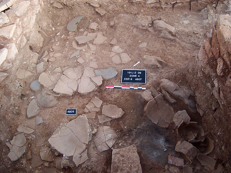 Réalisées dans des conditions parfois difficiles, les fouilles ont déjà livré de précieuses informations sur la séquence d’occupation propre à chacun des espaces concernés. Les données concordantes de la stratigraphie, de la céramologie et des datations au radiocarbone ont permis de confirmer que l’occupation principale du Jebel central remonte au XIIe siècle. Largement désertée après la période almohade, la montagne d’Îgîlîz offre un témoignage remarquable sur la culture matérielle de la région, et surtout sur les modes de vie d’une population montagnarde soucieuse de préserver ses ressources naturelles et son autonomie, tant politique et religieuse. Le mobilier archéologique est particulièrement abondant dans des pièces d’habitat, où il n’est pas rare de rencontrer, sur le niveau d’abandon d’époque almohade, l’intégralité des pièces céramiques laissées sur place par les anciens occupants (fig. 5).