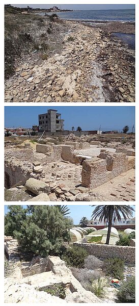 Par ailleurs, cette position littorale la situe dans un milieu marqué par des transformations environnementales rapides (Slim et alii 2003) qui se manifestent par des évolutions constantes du trait de côte, liées aux variations du niveau marin. La transgression marine (estimée à quelques dizaines de centimètres depuis l’Antiquité – Slim et alii 2003, 230) provoque des inondations ou l’ensablement/envasement de certains secteurs. Ces transformations environnementales affectent non seulement la région côtière mais également l’arrière-pays marqué par la présence d’une sebkha dont les mutations sont intimement liées à l’évolution du niveau marin. Ces évolutions ont nécessairement des conséquences sur les installations humaines et les activités liées à l’exploitation des ressources de ces milieux littoraux.