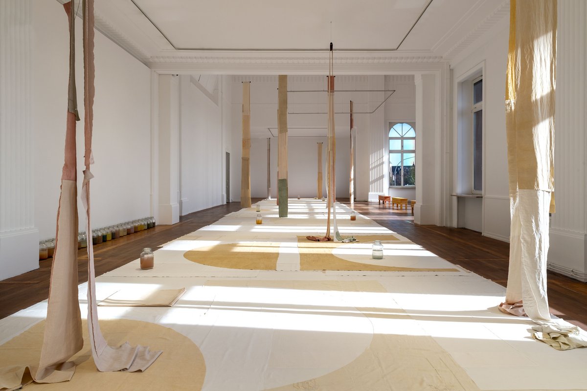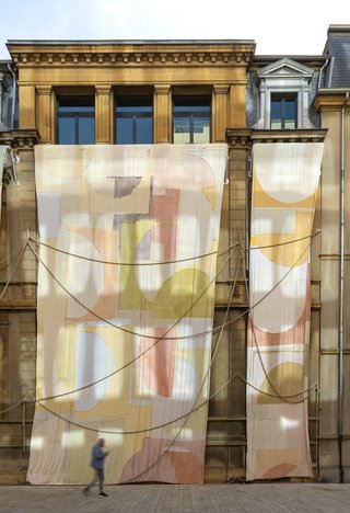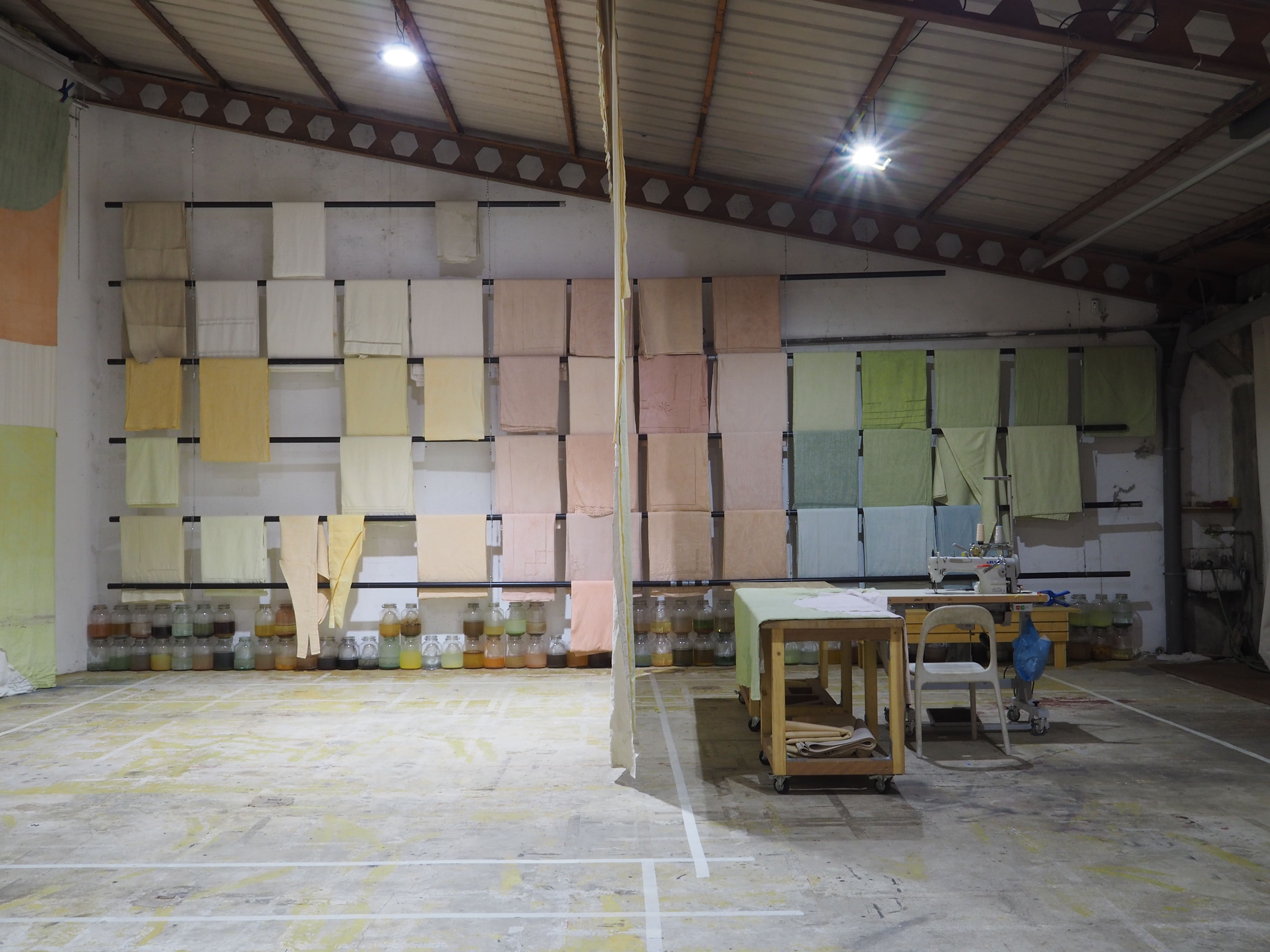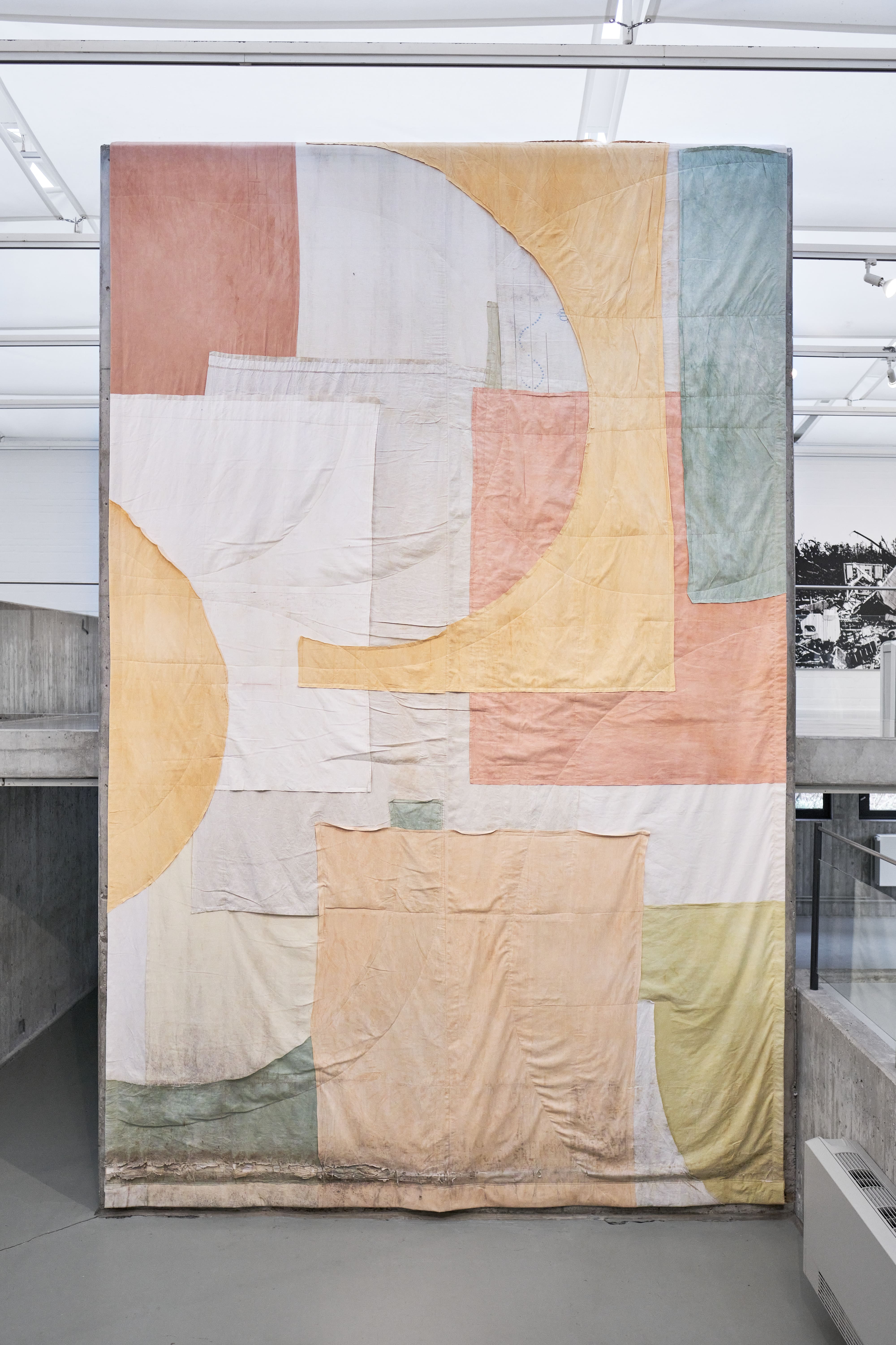 Adrien Vescovi réinvestit, avec des enjeux contemporains, la question de la toile libre et d’une peinture pensée à une échelle architecturale, naturelle et nomade. La question du temps, liée elle-même à celle du vivant, imprègne ses œuvres, sa réflexion et son processus artistique. Soucieux de ralentir sa pratique et de réduire son empreinte au maximum, il emploie des matériaux de seconde main, qu’il recycle et récupère, de même qu’il fait un usage raisonné de l’eau, plaçant ainsi la question de l’écologie au centre même de son processus de travail.